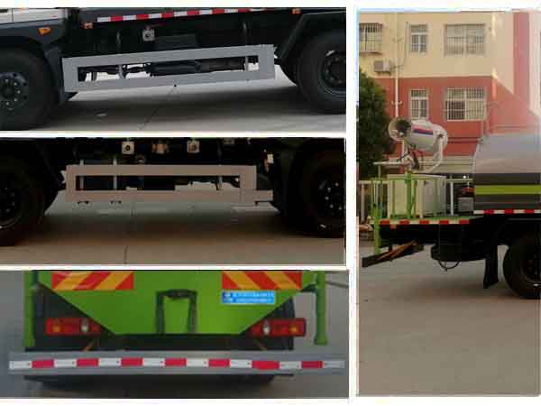 專用裝置為抑塵霧炮,用于城市抑塵,整車長度/軸距的對應關系為(mm):7700/3950,7950/4200,8250/4500,8450/4700,8850/5100,9350/5600;側防護及后下部防護裝置均采用Q235A材質,均采用焊接連接,后下部防護尺寸:120×50(mm),離地面高度500mm.ABS型號及生產廠家為:3631010-C2000/東科克諾爾商用車制動系統(十堰)有限公司,J ABS/焦作博瑞克控制技術有限公司.當整備質量為(kg):6680時,軸距為(mm):3950,4200,4500,當整備質量為(kg):7280時,軸距為(mm)4700,5100,5600.