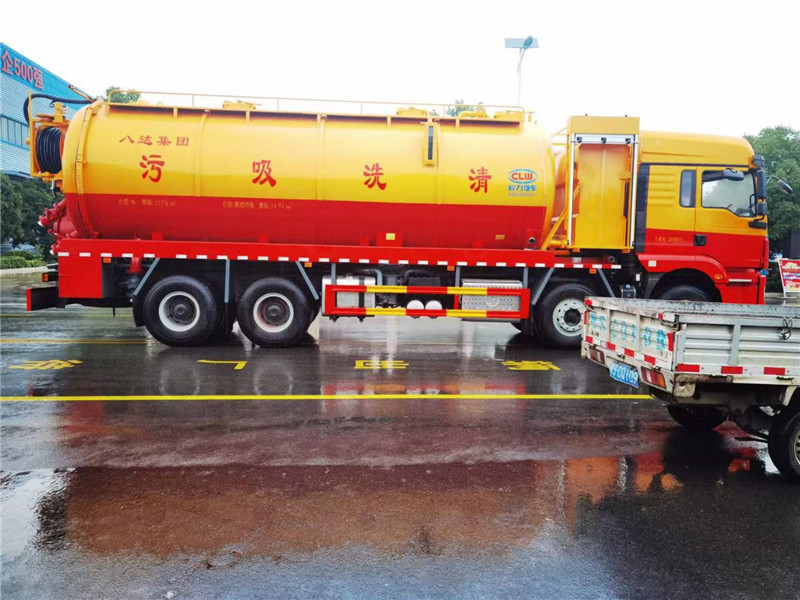 清洗吸污車上裝配置:罐體總容積約33立方,清水箱約10立方,其余為污水罐,加強大架,兩倉互通,采用8mm碳鋼制作,吸污部分,副發采用斷袖取力器配42水循環泵,8米吸污管,罐體兩側加寬平臺加護欄,后部開一個800mm液壓開啟排污口,一個150排污球閥,和一個100的排污球閥,100內抽球閥,偷排150球閥,后部左右各一個箭頭燈,配品浮350流量,配100米內徑25定制耐磨高壓管,卷盤液壓左右旋轉,配10公斤槍頭一個。整車顏色:黃/紅